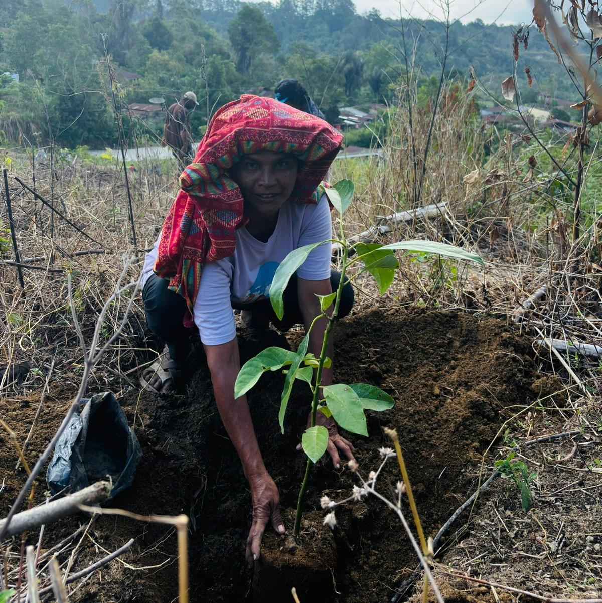 Seorang perempuan adat Dolok Parmonangan sedang menanam pohon di atas wilayah adatnya. Dokumentasi AMAN