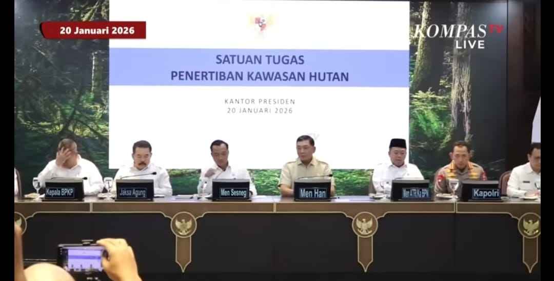 Pemerintah sedang mengumumkan pencabutan izin operasional 28 perusahaan di Istana Negara Jakarta. Sumber foto KompasTV