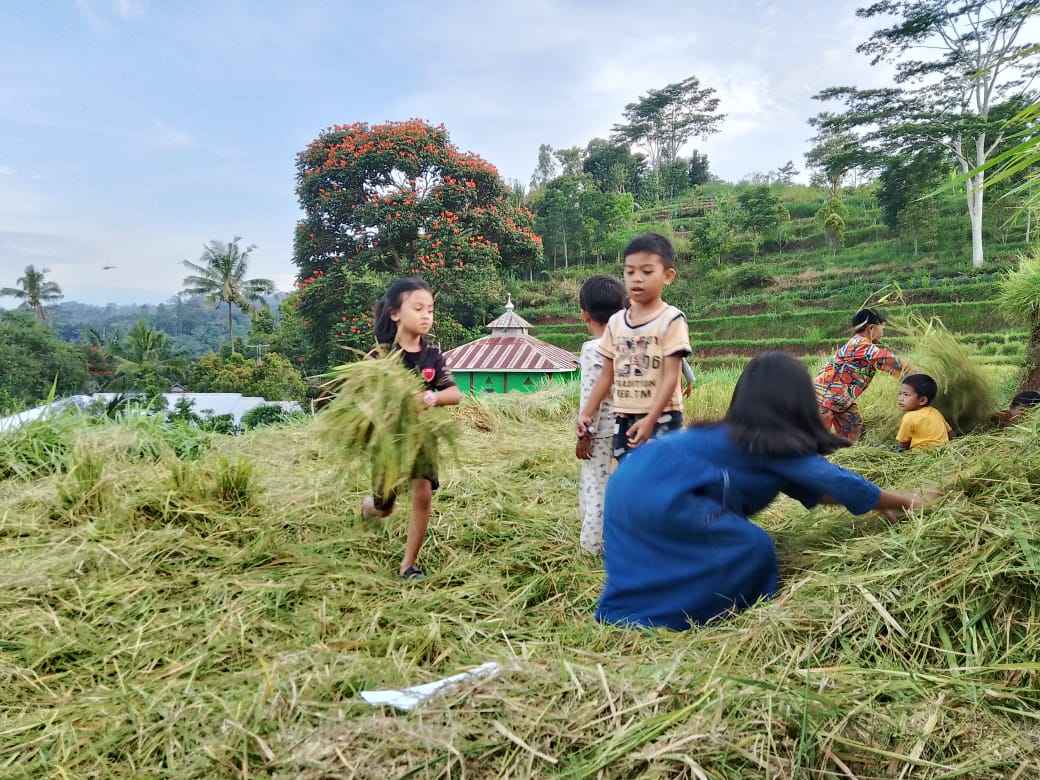 Sejumlah anak sedang membantu orangtuanya ikut mengumpulkan jerami untuk makanan sapi pasca panen padi di sawah. Dokumentasi AMAN