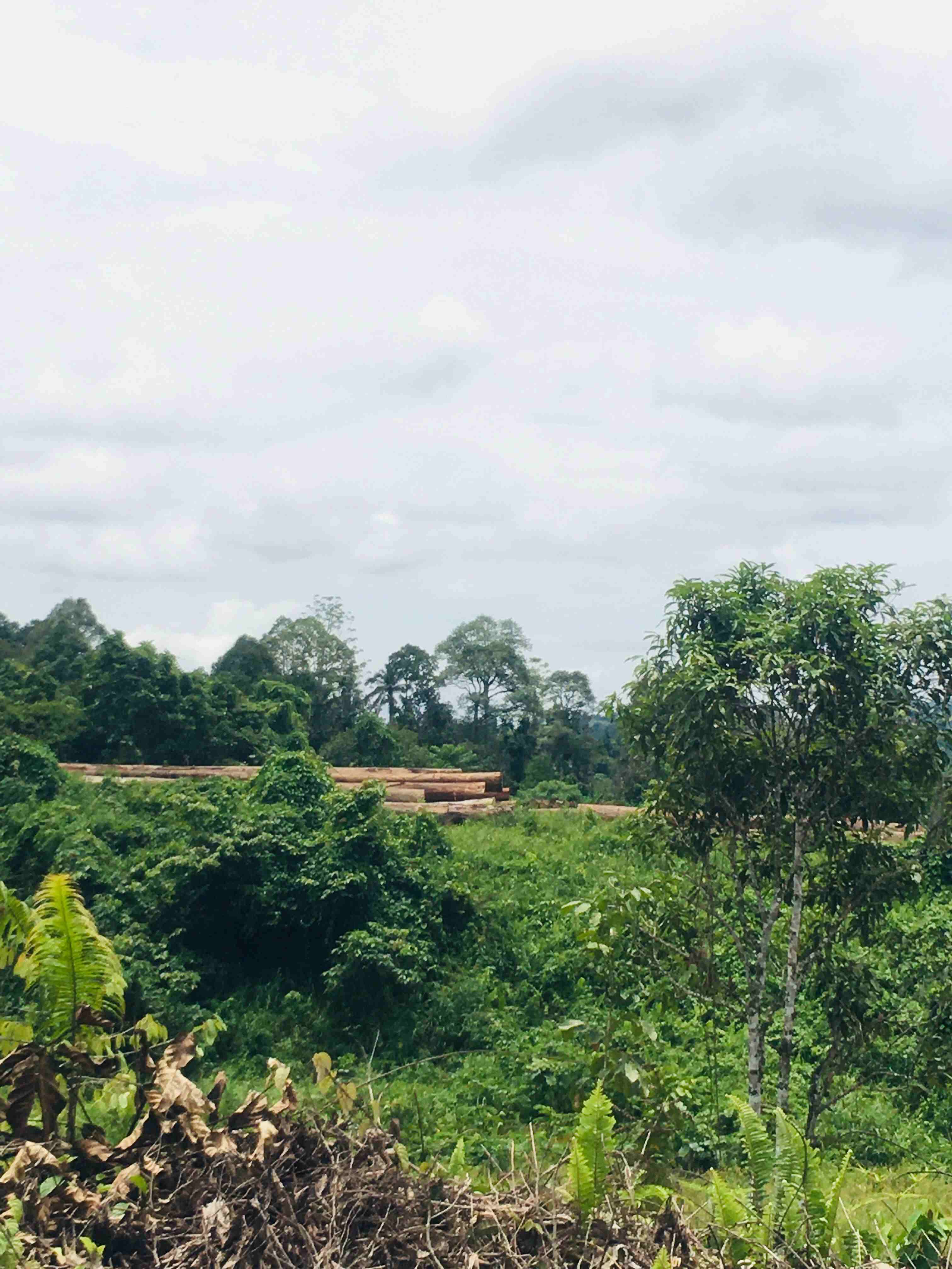 Kayu gelondongan dari hasil penebangan hutan menumpuk di camp tampungan, dekat dengan ladang dan persawahan Masyarakat Adat. Dokumentasi AMAN