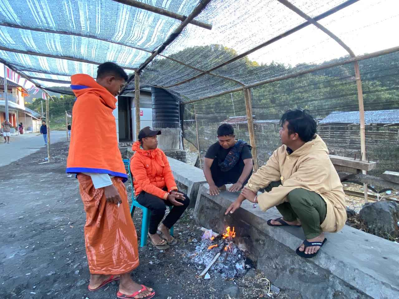 Beberapa orang pria sedang menghangatkan tubuh mereka di kaki gunung Rinjani. Dokumentasi AMAN